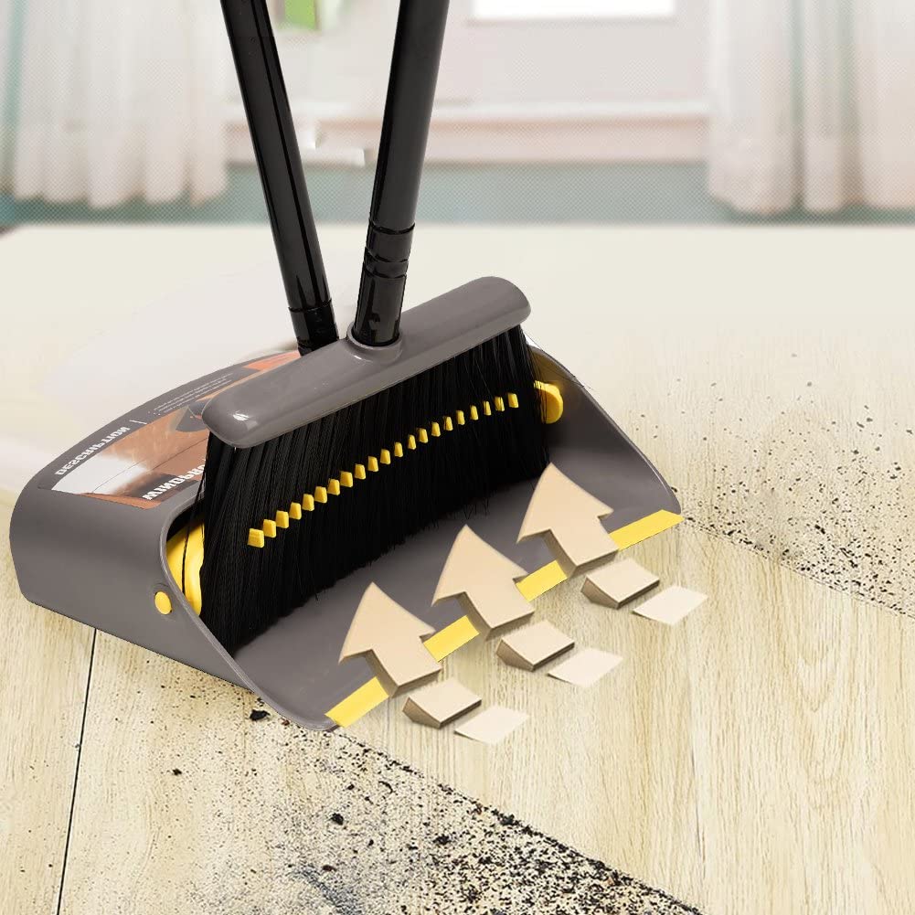 - 🏡Broom with dustpan combo set Built in scraper and comb/Teeth for easy to Clean Broom into Dustpan ,Clean Pet Hair and Human Hair with one Pull on the Teeth. Sturdy Construction,Rustproof Poles of Broom Dustpan Long Handle